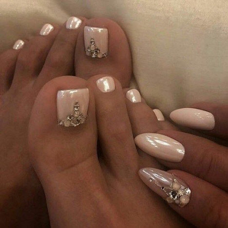 Helle Töne in der Maniküre und Pediküre sind eine universelle Lösung, denn Nude-Töne ergänzen jeden Look und sind sowohl im Urlaub als auch im Alltag immer praktisch. Wenn Sie eine Maniküre oder Pediküre ein wenig hervorheben möchten, können Sie Kieselsteine oder Glitzer hinzufügen, sie sehen auf Pastelltönen von Lacken sehr schön aus.