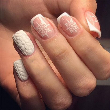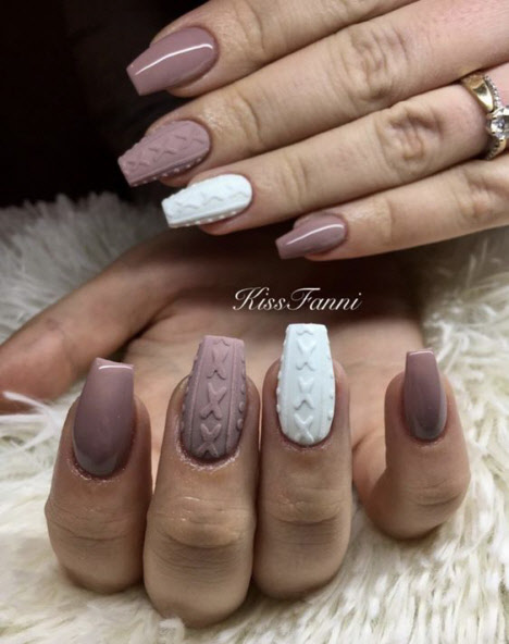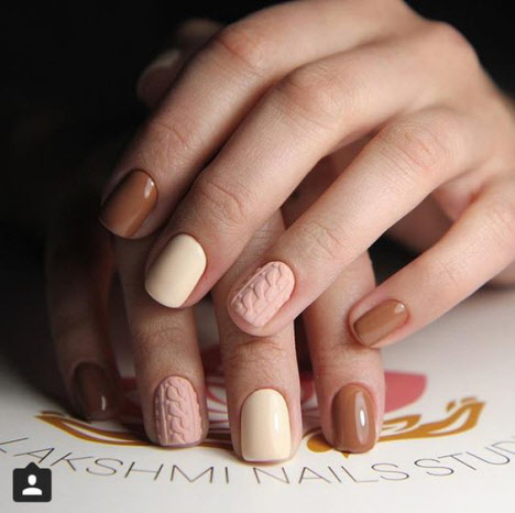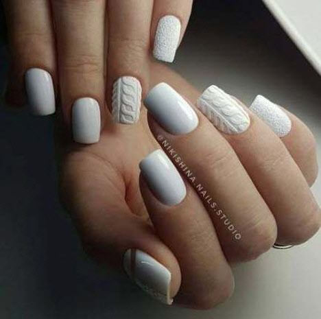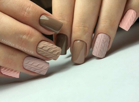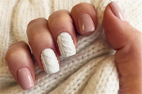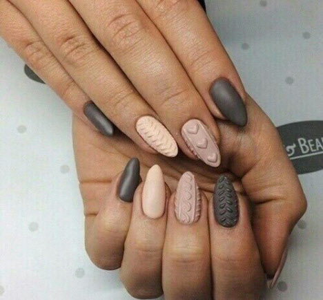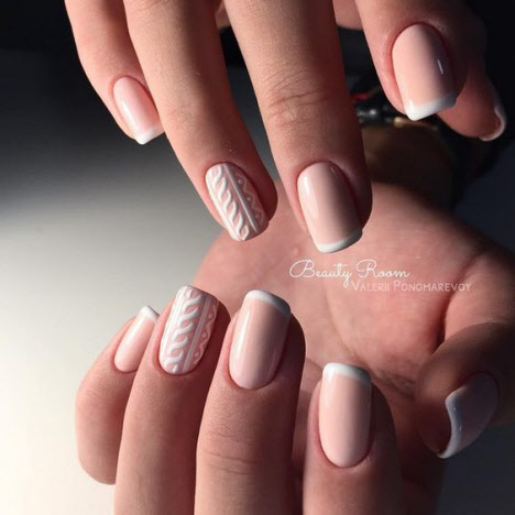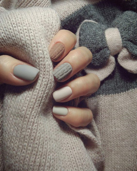 Gestrickte Maniküre in Nude-Tönen sieht sehr schön aus, und weißer Lack, Grau, Blau, Rosa, Beige reicht auch.
