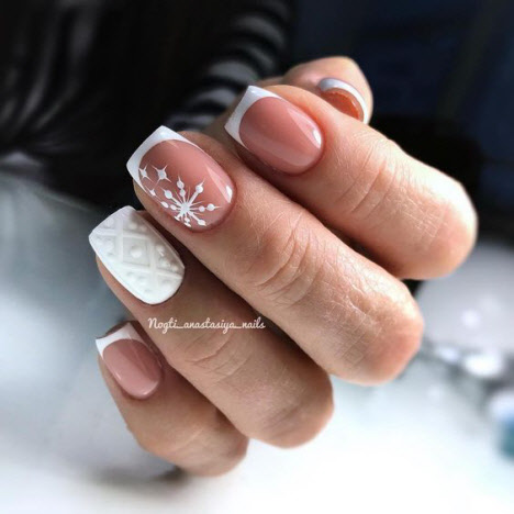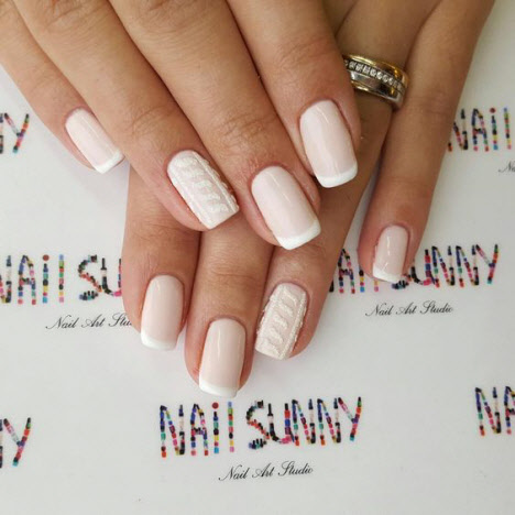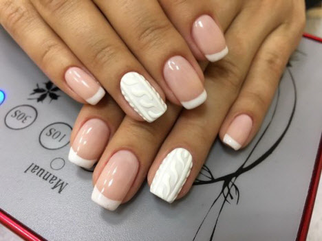Wenn Sie eine ungewöhnliche French Manicure kreieren möchten, dann sind Akzente in Form einer Strickmaniküre ideal für Herbst und Winter, es reicht aus, nur ein oder zwei Nägel zu dekorieren und Ihre Jacke wird anders spielen. Eine solche Maniküre sieht sehr gemütlich und süß aus und gleichzeitig geht die Eleganz einer French Maniküre nicht verloren. Außerdem passt es zu jedem Outfit und Image.