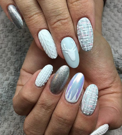 Die Ausführungstechnik kann in Form von Zöpfen, Streifen, Häkchen, Rauten erfolgen. Wenn Sie die Gelpolitur mit Sand oder Puder bestreuen, entsteht die Wirkung eines Nickerchens aus einem Pullover.