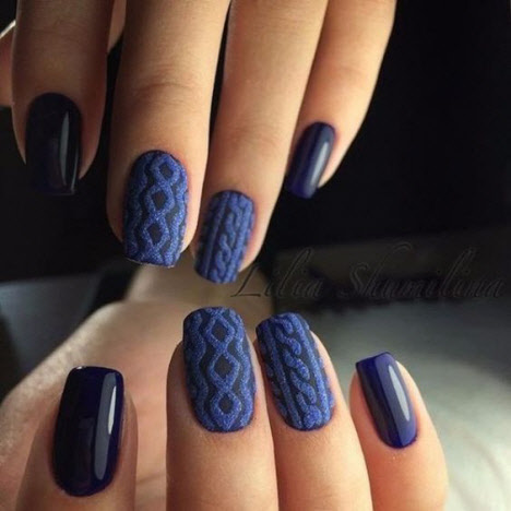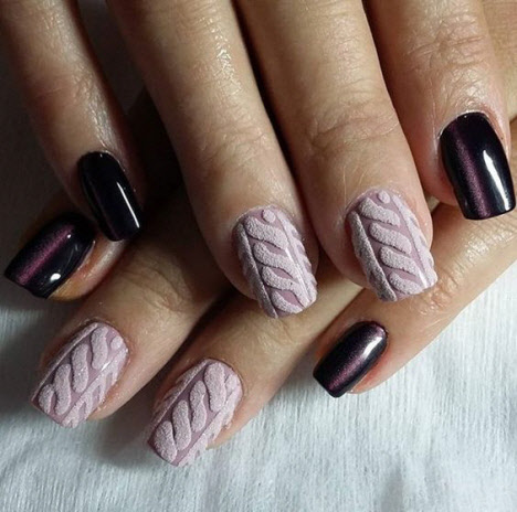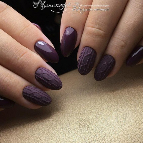 Pullover-Maniküre passt gut zu dunklen Lacken: Lila, Smaragd, Dunkelblau, Burgund und natürlich Schwarz. Das voluminöse Design auf den Nägeln in Form eines Pullovermusters wirkt in Kombination mit dunklen, gesättigten Lacktönen sehr stylisch.