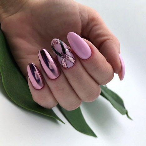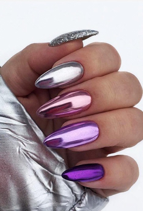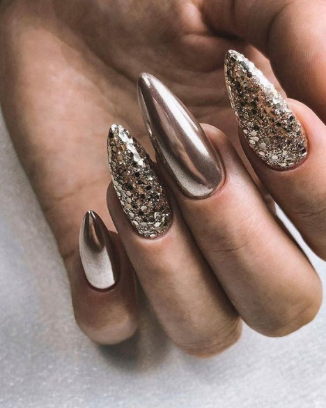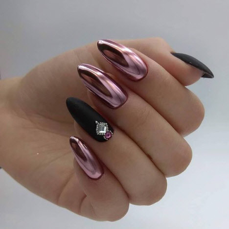 "Spiegelglanz" einreiben - für eine Spiegelmaniküre verwenden Sie Silber-, Gold- und Bronzetöne. Eine solche Maniküre sieht sehr stilvoll aus, aber um sie zu erstellen, muss die Nagelplatte in einwandfreiem Zustand sein, ohne Mängel, da auf der Spiegeloberfläche alles sichtbar ist.