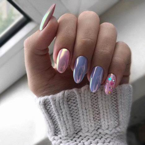 "Holographisches Reiben" - Um eine solche Maniküre zu erstellen, verwenden Sie ein silbriges Pigment und um eine Sättigung zu erreichen, müssen Sie Pulver mit hellen und dunklen Lacken kombinieren.
