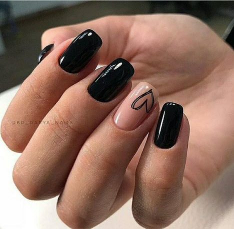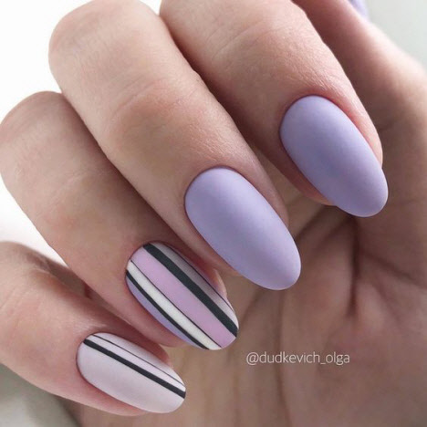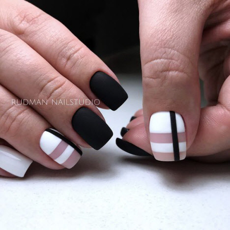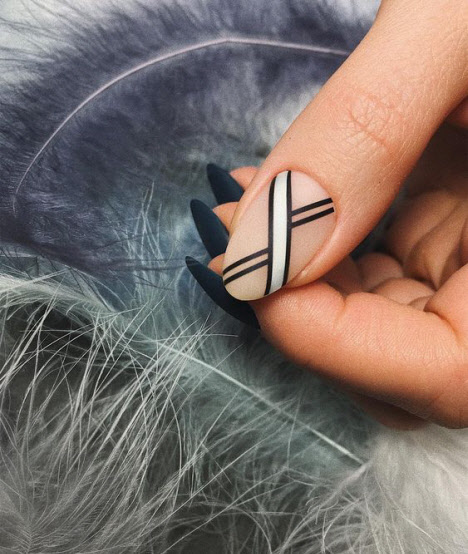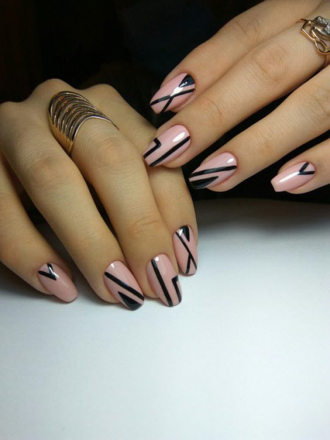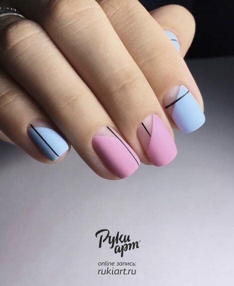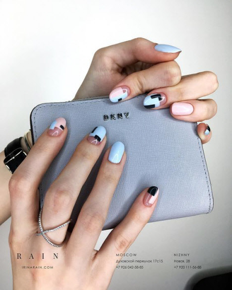 Der erste Trend in der modischen geometrischen Maniküre ist eine Kombination von Pastellfarben mit schwarzem Lack. Diese Maniküre sieht sehr stylisch und unauffällig aus. Es ist die Kombination dieser beiden Farben, die den Modetrend in der geometrischen Maniküre von 2024 setzen wird.