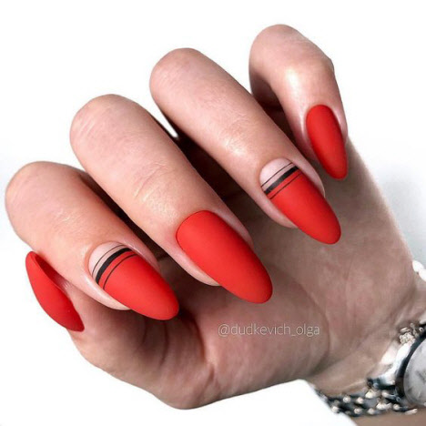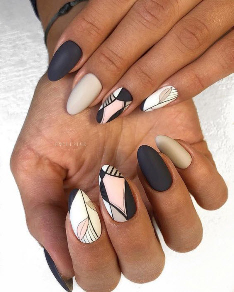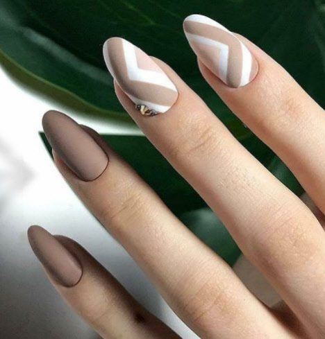 Und der vierte Trend 2024 – all diese bisherigen Punkte lassen sich mit einem matten Finish kombinieren. Ein mattes Finish in Kombination mit geometrischen Mustern ist eine Win-Win-Option für diejenigen, die der Mode der Maniküre-Nagelkunst folgen.