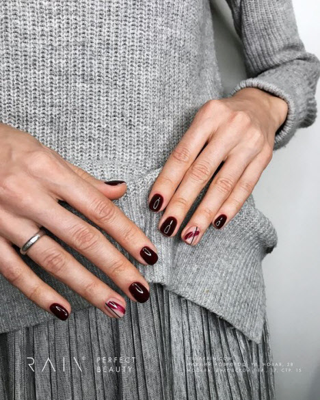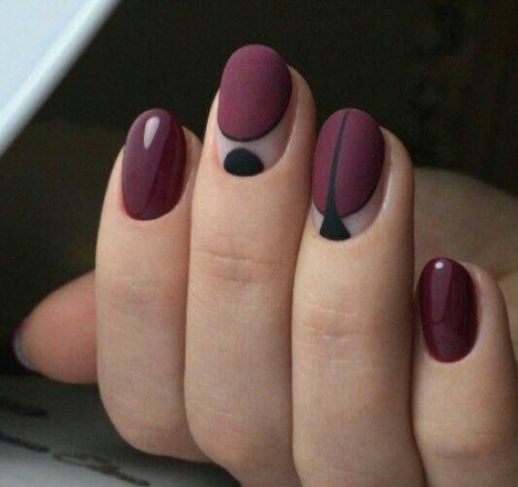 Der zweite Trend sind dunkle, gesättigte, tiefe Farben mit abstrakten Elementen. Es ist ziemlich schwierig, Abstraktion auf Nägeln zu erzeugen, Sie müssen sich unbedingt an einen erfahrenen Meister wenden, der Ihre Ideen zum Leben erwecken kann.