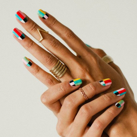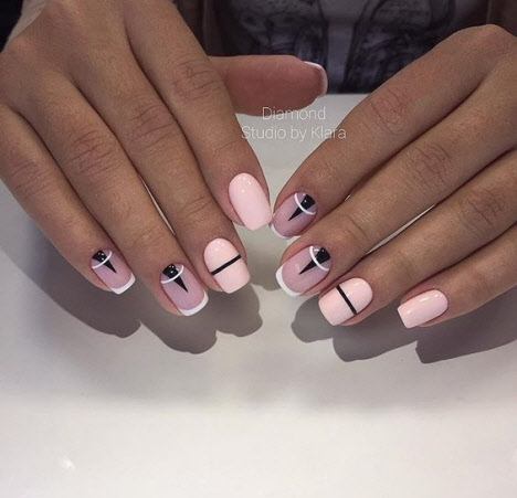 - Geometrische Maniküre. Geometrische Maniküre ist so vielseitig, komfortabel und schön, dass sie in der Nagelindustrie immer noch auf dem Höhepunkt der Popularität ist. Die Farbbasis von Lacken ändert sich nur von Saison zu Saison.