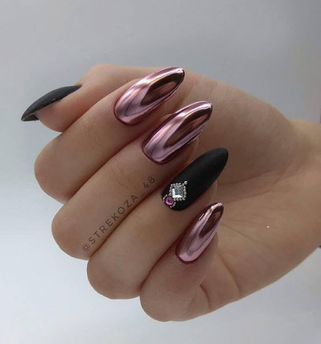Spiegelpolitur ist völlig unabhängig, daher benötigen die Nägel kein zusätzliches Dekor. Diese Maniküre wird am besten in einer Farbe durchgeführt oder mit einem normalen Lack desselben Farbtons kombiniert.