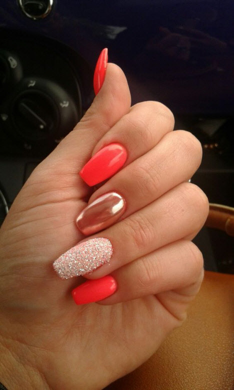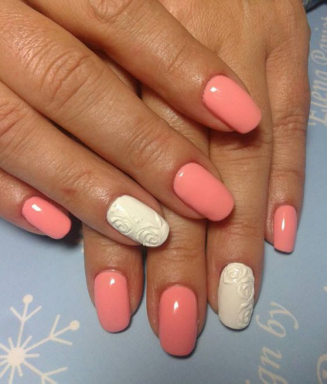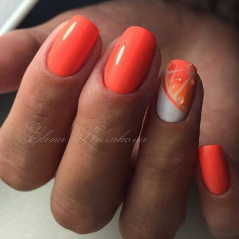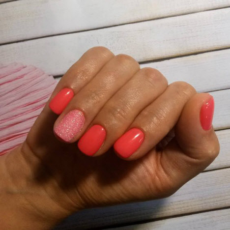 Living Coral ist laut Pantone die Hauptfarbe der Saison nicht nur in der Kleidung, sondern auch in der Maniküre. Eine Palette von Korallentönen - von leuchtendem Orange-Rot bis hin zu ruhigeren Pfirsichtönen. Nagelmeister empfehlen, es mit Pastellfarben von Lacken oder Glitzern, Abstauben und Kieselsteinen zu kombinieren.