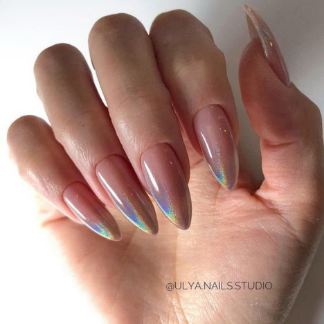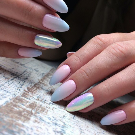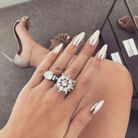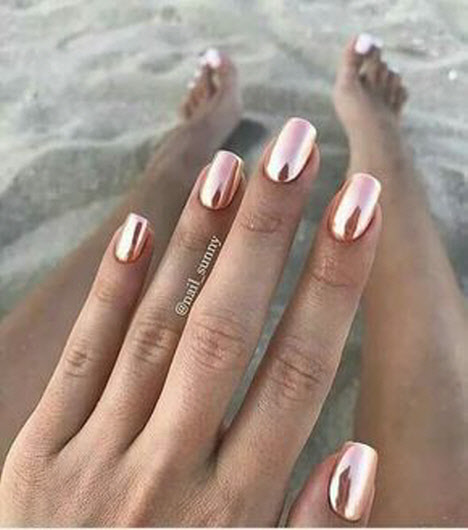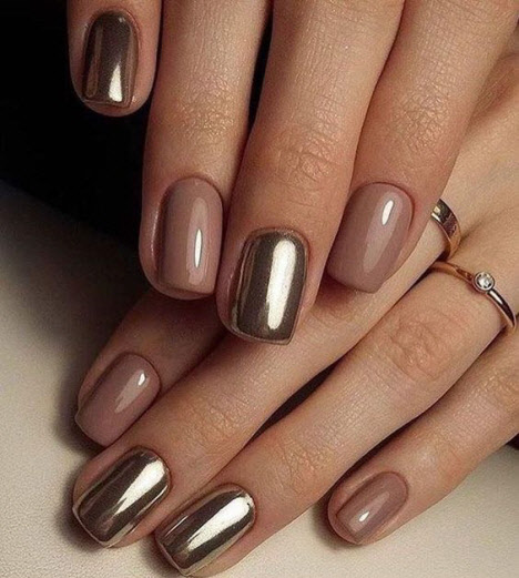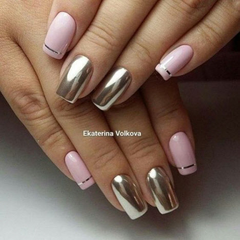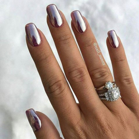 Im Vergleich zu anderen Lackarten hat Lack mit Metallic-Effekt eine dickere Konsistenz, was jedoch ein leichtes und gleichmäßiges Auftragen der Beschichtung nicht verhindert. Viele Leute denken, dass Metallic nur Gold- oder Silbertöne von Lacken sind, aber tatsächlich gibt es viele Farben: Beige, Pink, Blau, Lila, Blau, Rot-Karmesin. Gold- und Silbertöne gelten als Klassiker der Spiegelmaniküre und werden noch viele weitere Saisons im Trend liegen.