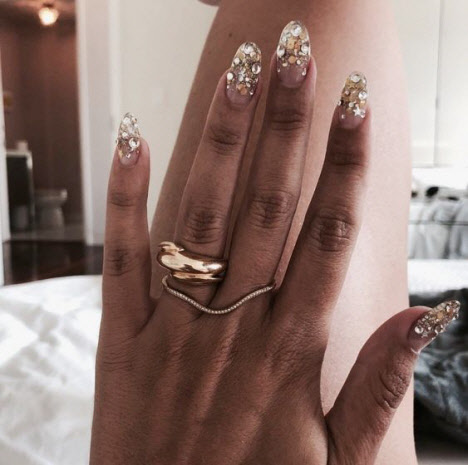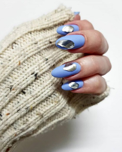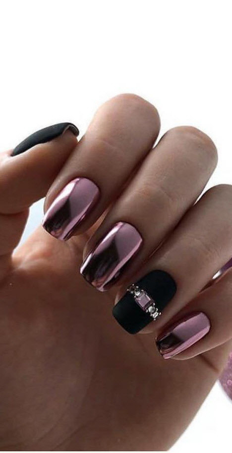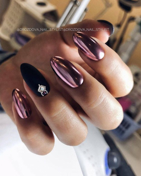 Eine modische Spiegelmaniküre, oder auch Maniküre mit Einreiben genannt, ist eine schicke Ergänzung für einen Abendlook. Eine geriebene Maniküre wirkt bereits ohne Design autark, obwohl sie gut mit Strasssteinen harmoniert, können Sie mehrere Kieselsteine auf einem Nagel in Form eines Akzents hinzufügen.