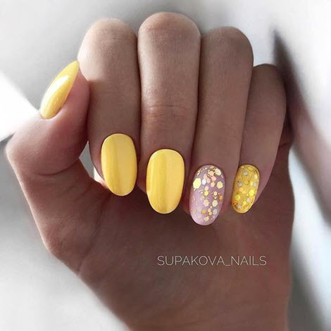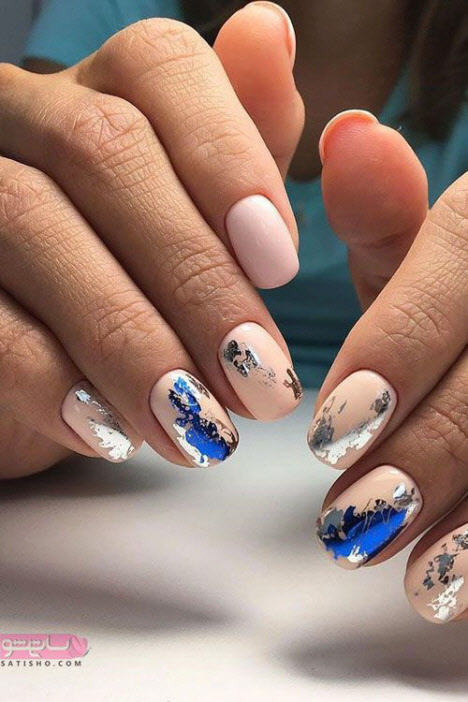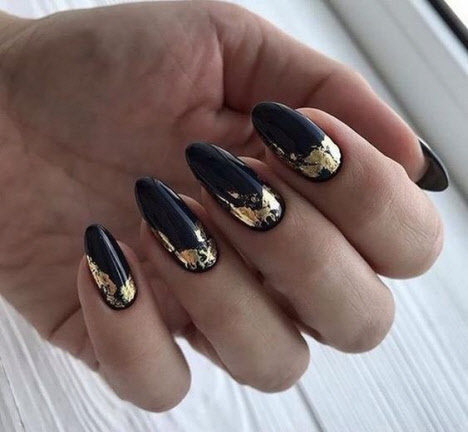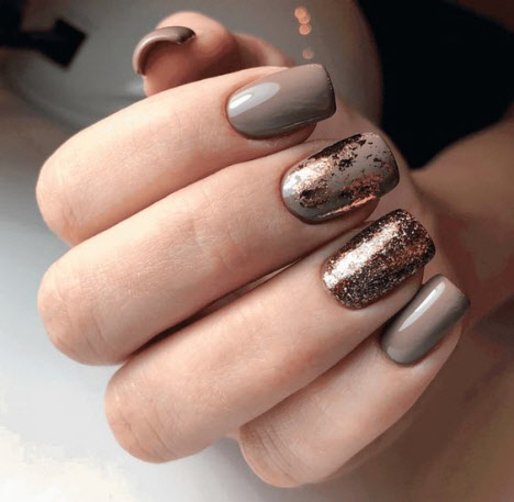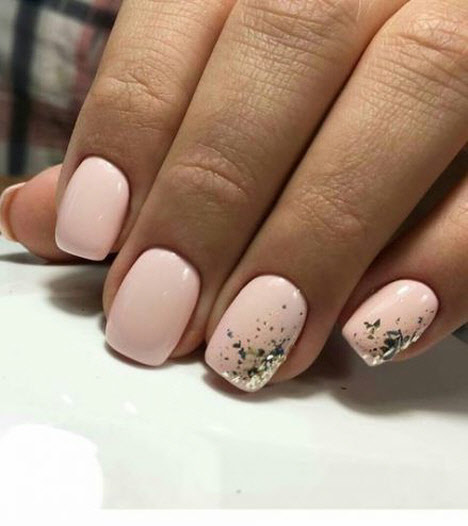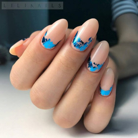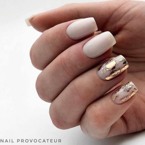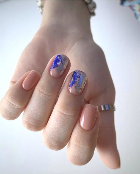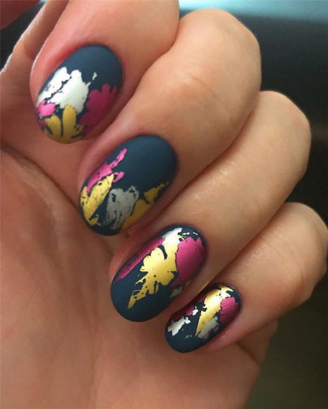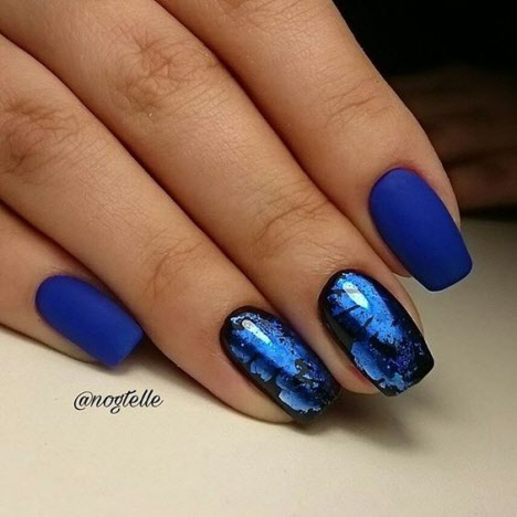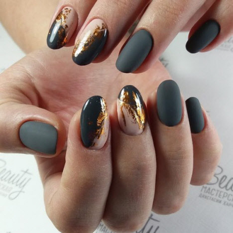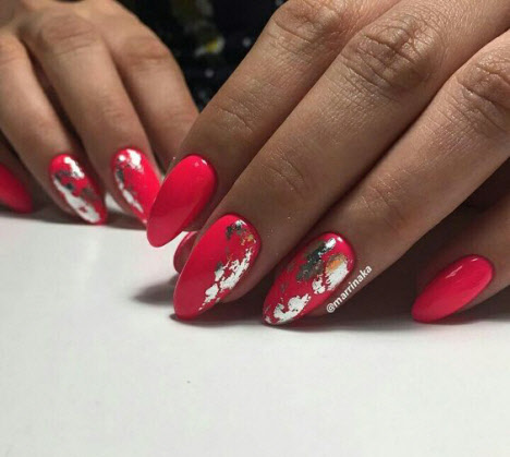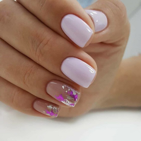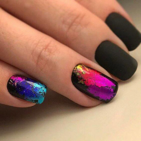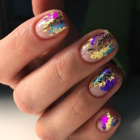 Mit Hilfe von Folie und Gelpolitur können Sie eine sehr stilvolle und schöne Maniküre machen. Folie kann verschiedene Arten haben, Sie können genauer in lesen Dies Artikel, sowie verschiedene Größen und Farben. Goldene Folie sieht am effektivsten aus, sie passt zu jeder Lackfarbe, aber farbige Folie kann auch in einer Maniküre schön geschlagen werden, siehe Beispiele unten auf dem Foto.