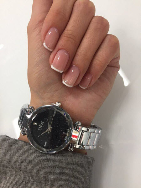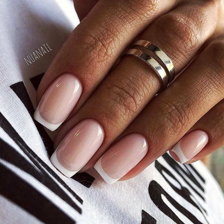French Manicure ist elegant und sieht immer teuer aus. Dies ist ein natürlicher Manikürestil, der eine transparente oder nackte Grundfarbe und eine weiße Spitze umfasst. Diese Version der Jacke sieht teuer und stilvoll aus. French Manicure ist ein Klassiker, der nie aus der Mode kommt. Sie können dieses Nageldesign zu jeder Jahreszeit und für jeden Anlass sicher wählen.