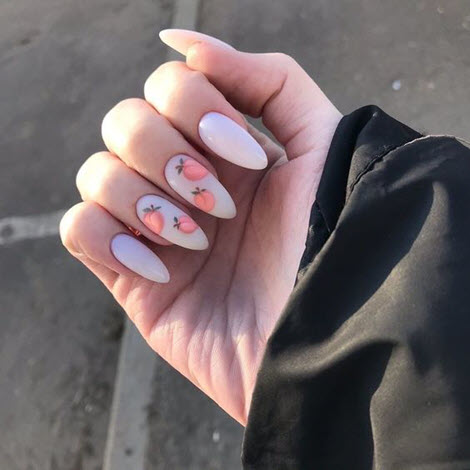 Eine Maniküre mit Früchten und Beeren im Jahr 2024 kann in hellen saftigen Tönen und Pastelltönen sein, meistens ist es eine Frucht, die in einem Schnitt dargestellt ist. Es ist ratsam, die Zeichnung von Hand zu zeichnen, denn dank der Handbemalung sieht das Design solide und schön aus. Wenn es nicht möglich ist, ein Bild zu zeichnen, können Sie Stempel und Dias verwenden.