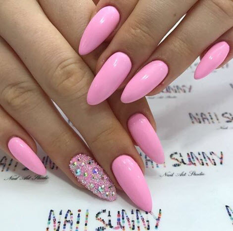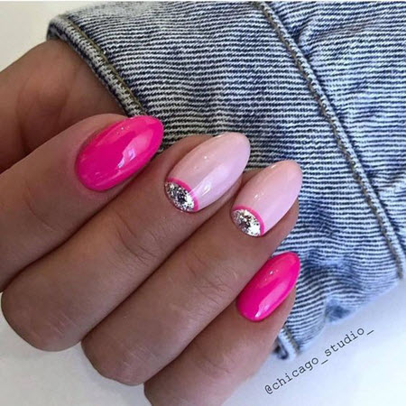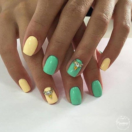 Für eine schicke Abendmaniküre im Sommer sind Steine und Strasssteine unverzichtbar. Sie sollten nur für einen Akzent bei einer monochromatischen Maniküre auf einem oder zwei Nägeln verwendet werden. Die Steine können in einem Muster ausgelegt werden oder die gesamte Nagelplatte bedecken.