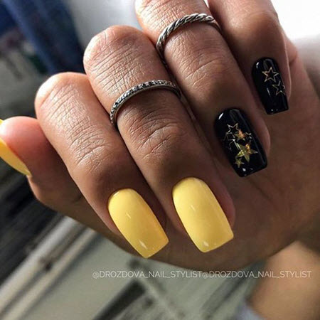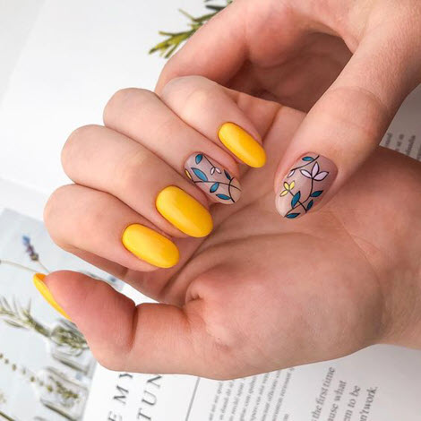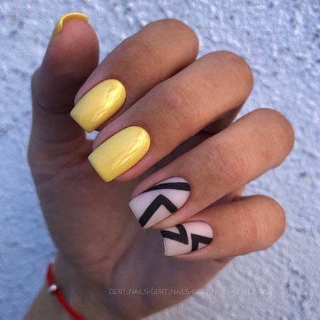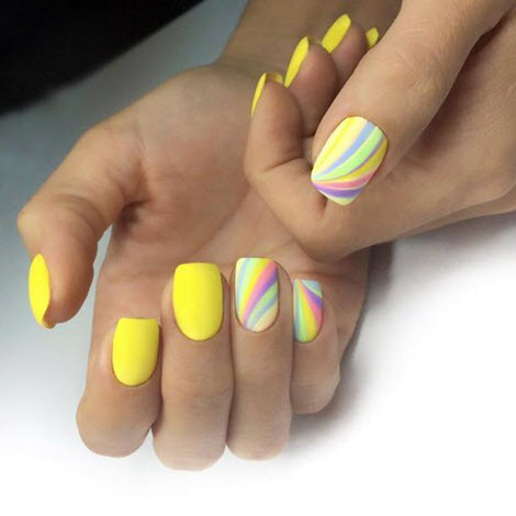 Diese schöne Sommerfarbe wird Ihre Maniküre wirklich sommerlich und so schön machen. Die gelbe Maniküre wird 2024 mit Steinen und Glitzern sowie mit Kamifubuki und mit Reiben und anderen Arten von Nageldesigns kombiniert.