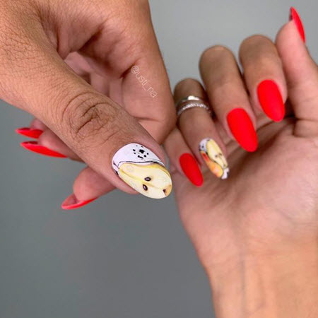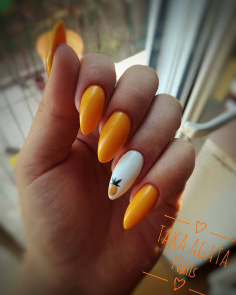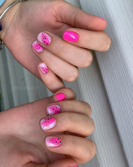 Sommermaniküre mit Erdbeeren, Wassermelone, Himbeeren, Ananas, Banane, Kiwi, Avocado und sogar mit dem Image einer Orange und Zitrone liegt im Trend.