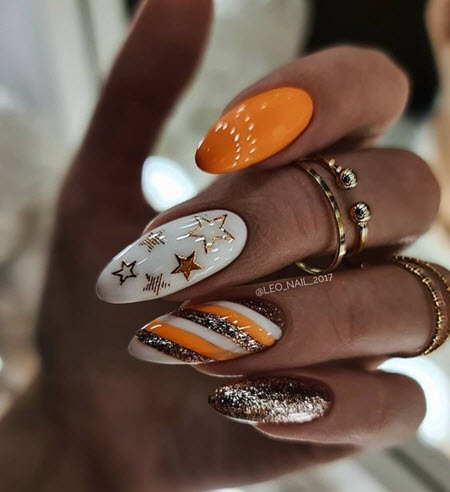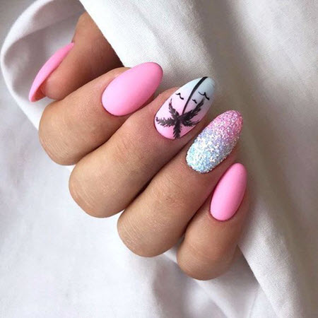 Um es bei der Sommermaniküre nicht mit Glitzern zu übertreiben, tragen Sie sie nicht auf alle Nägel auf, es reicht aus, sich auf einen oder zwei zu konzentrieren, es kann ein bestimmtes Muster sein oder Sie können die gesamte Nagelplatte mit Glitzern bedecken.