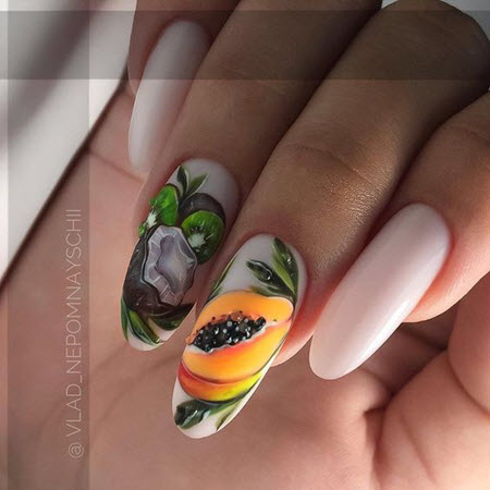 Die Zeichnung wird von Hand mit einem Pinsel erstellt, daher erfordert dieses sommerliche Nageldesign das Können eines Meisters. Um Zeichnungen zu erstellen, werden spezielle Aquarell-Gel-Lacke (Aquarellfarbe) verwendet.