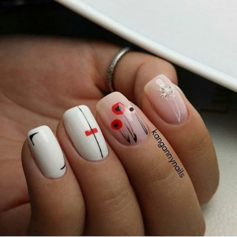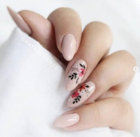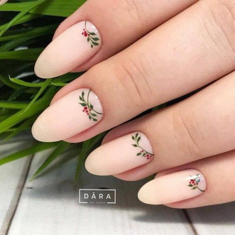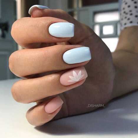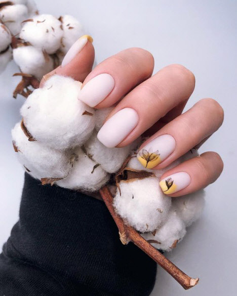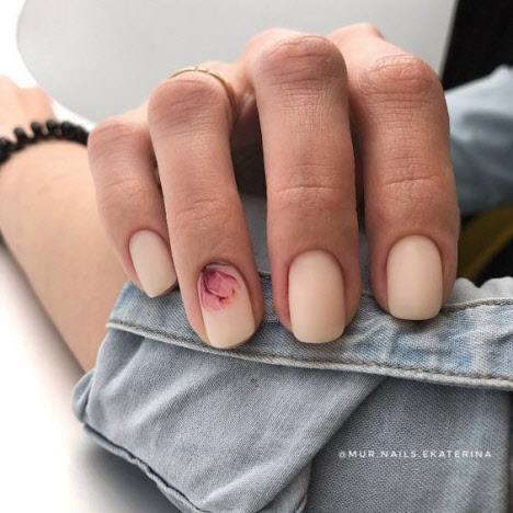 Es werden ruhige neutrale Farbtöne zugrunde gelegt und das Blumenmuster mit schwarzer, grauer oder weißer Gelfarbe aufgetragen, obwohl die Blüten manchmal hell und kontrastreich sind, aber Sie sollten sich trotzdem an die Farbpalette der Maniküre halten. Die Blüten selbst sollten klein und ordentlich sein. Inspirationen finden Sie auf dem Foto unten: