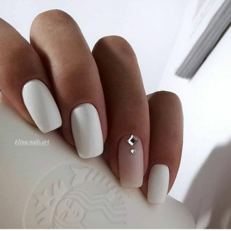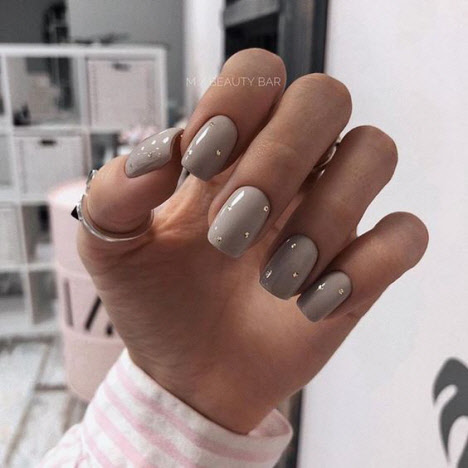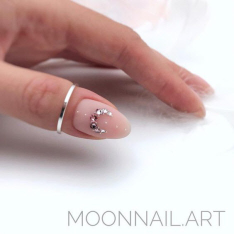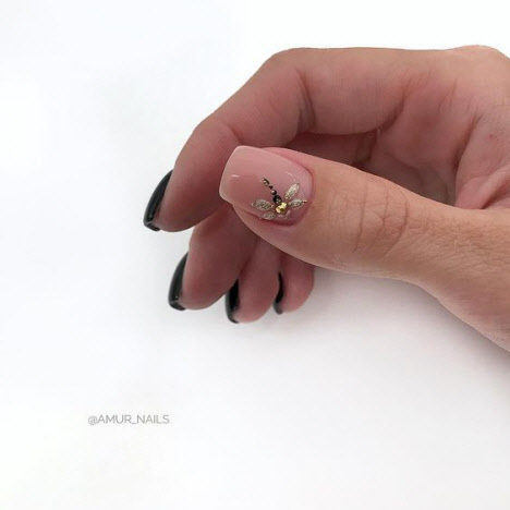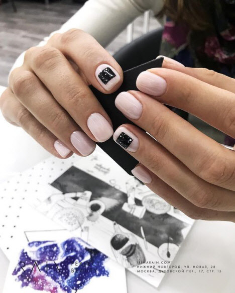 Die Maniküre ist zwar mit Kieselsteinen, aber im Stil des Minimalismus wirkt sie zurückhaltend, ordentlich und gleichzeitig sehr schön. Verwenden Sie bei dieser Art der minimalistischen Maniküre ein Minimum an Details und konstituierenden Designelementen, dh einen Kieselstein, konzentrieren Sie sich auf einen oder zwei Nägel.