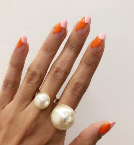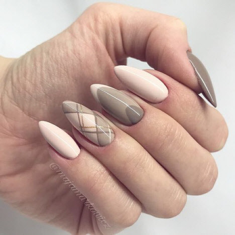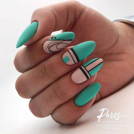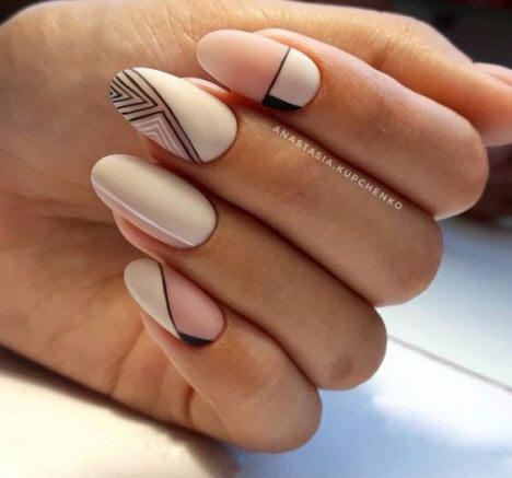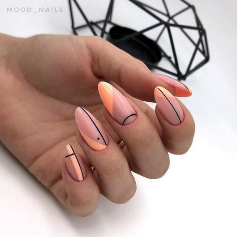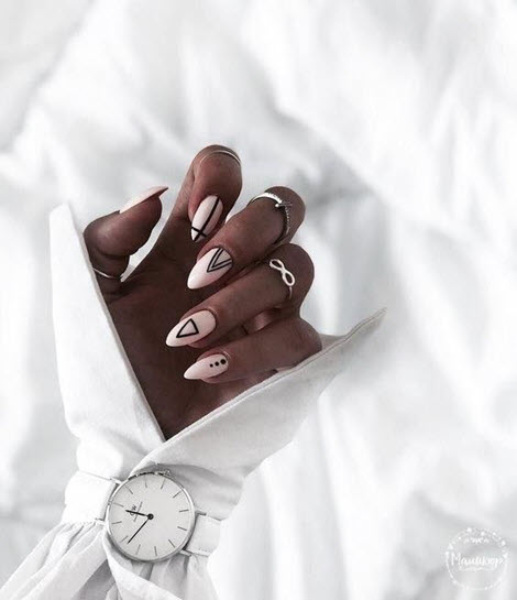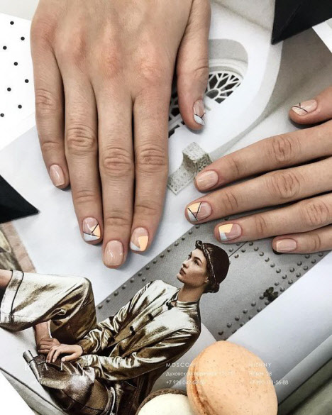 Die stilvolle Geometrie im Jahr 2024 wird unter den Optionen für minimalistische Maniküre ganz oben stehen. Geometrische Formen (Linien, Dreiecke, Quadrate, Rauten, Punkte) lassen sich vielfältig kombinieren und erhalten eine sehr modische Maniküre. Die Maniküre im geometrischen Stil sieht selbst in Nude-Tönen stilvoll und autark aus, lakonische Muster können auf einer Ringelblume oder auf allen platziert werden und bis zu drei Lacktöne kombinieren.