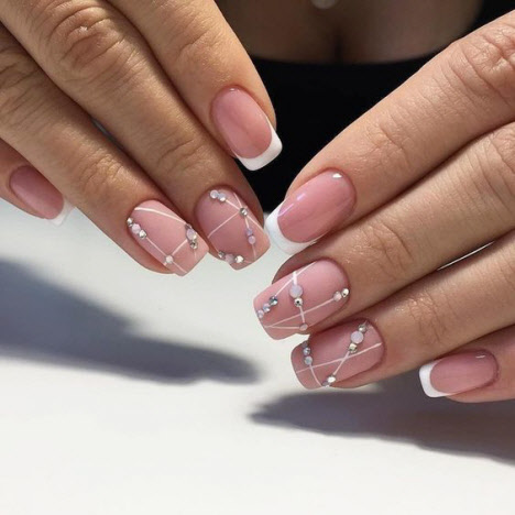 Vervollständigen Sie eine zarte Maniküre für kurze Nägel mit einem dezenten dezenten Muster, geometrischen Mustern, Glitzern oder Kieselsteinen. Eine solche Maniküre wird immer anmutig und feminin aussehen.