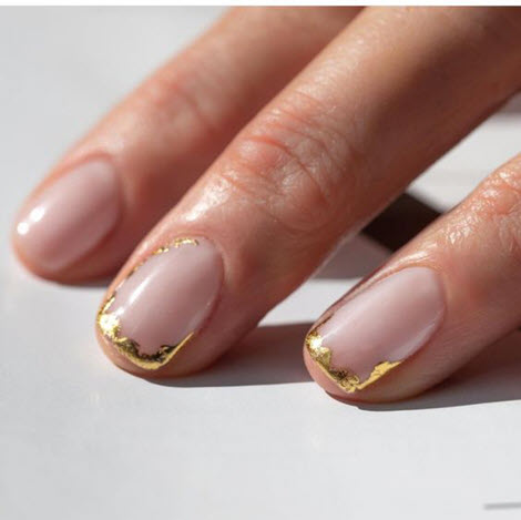 Manikürefolien können verschiedene Größen, Farben und Typen haben (Blatt, komprimiert, Transfer, Streifen, Flüssigkeit, in Form eines Films). Farbige Folie sieht gut auf Nude-Lackfarben aus und Gold- oder Silberfolie ist ideal für dunkle Lacktöne.