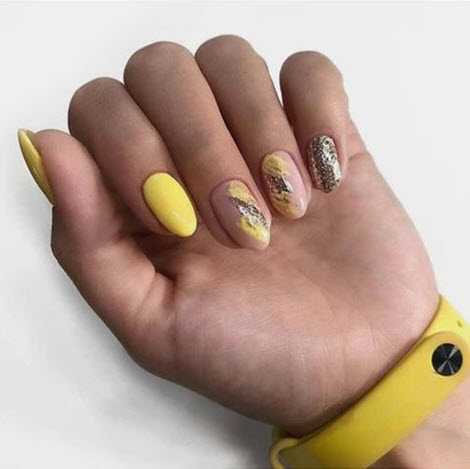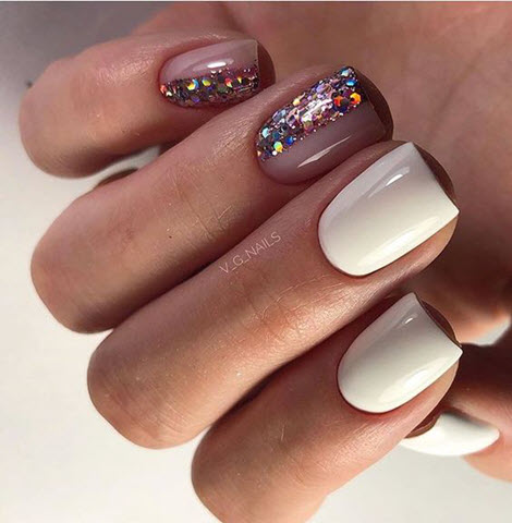 Pailletten können sogar für die tägliche Maniküre für kurze Nägel ausgewählt werden, sie verleihen Ihren Nägeln Helligkeit und Spiel. Pailletten werden mit allen Lacktönen kombiniert, mit deren Hilfe Sie sogar eine monochromatische Maniküre in Pastellfarben abwechslungsreich gestalten können.
