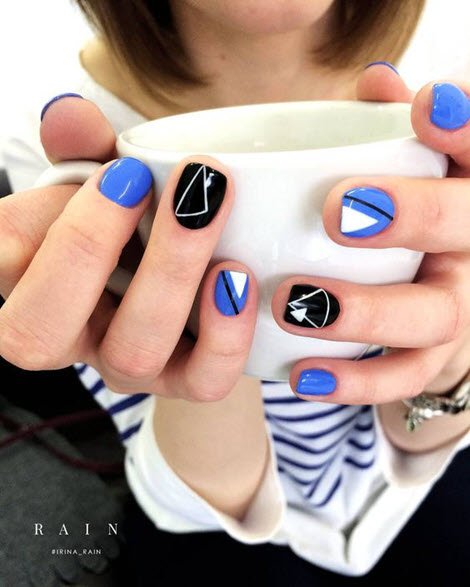 Die Streifen können dick, dünn, fließend oder gekräuselt sein. Linien und Streifen lassen sich in beliebigen Mustern und sogar geometrischen Formen anlegen, auch mit verschiedenen Farben können Sie spielen. Maniküre mit Streifen kann zu jeder Jahreszeit durchgeführt werden und wird mit den aktuellen Farben von Lacken und Mustern ergänzt.