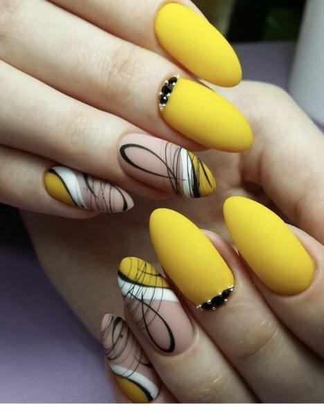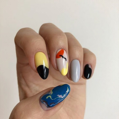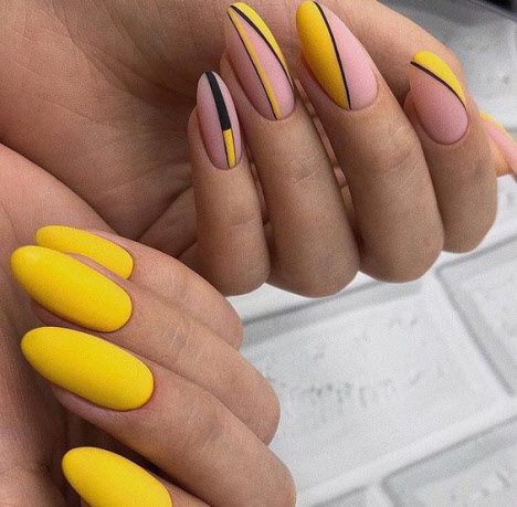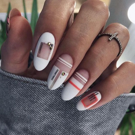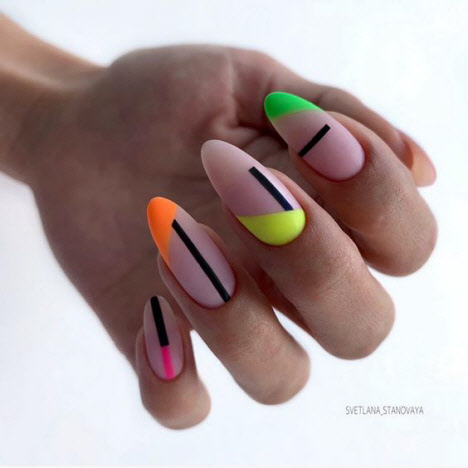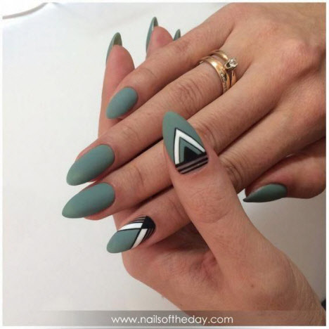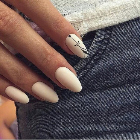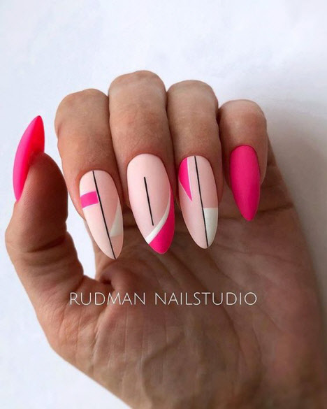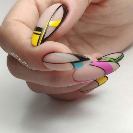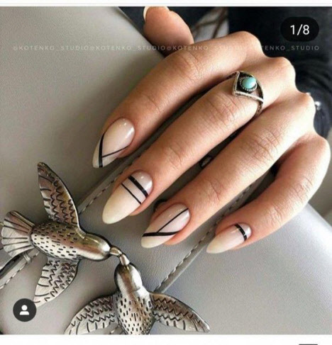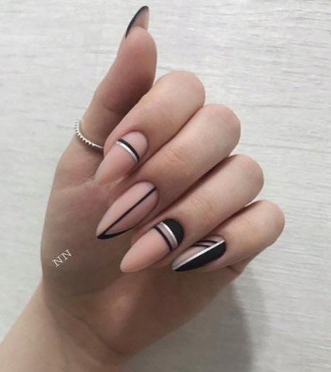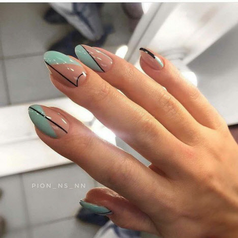 Auf den mandelförmigen Nägeln können Sie sehr interessante und schöne Optionen für die geometrische Maniküre machen. Verschiedene Linien, Kreise, geometrische Formen und interessante Lacktöne ermöglichen es Ihnen, Ihre perfekte Maniküre zu kreieren.