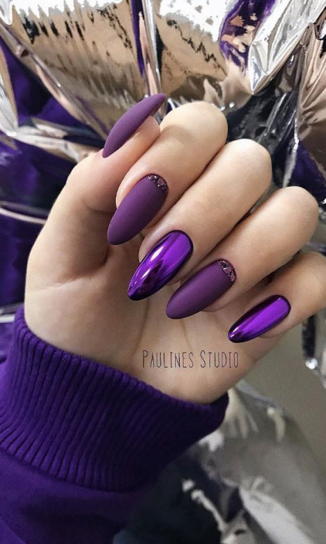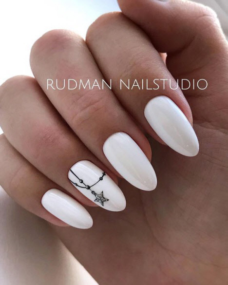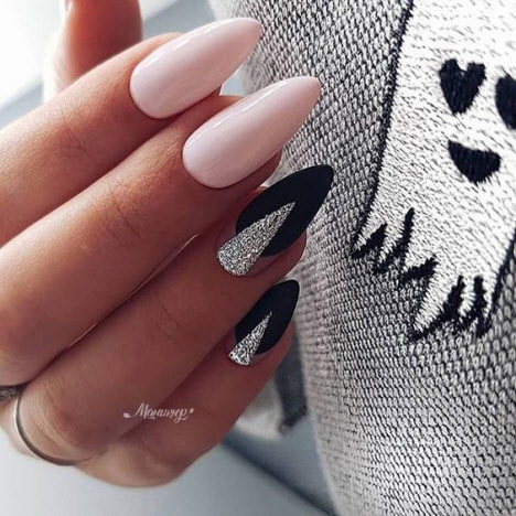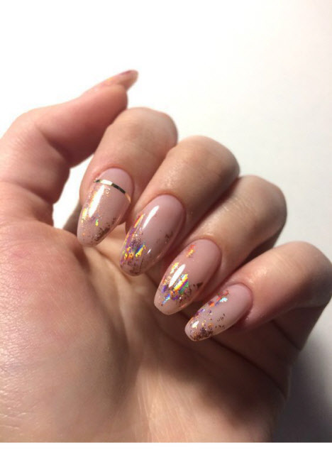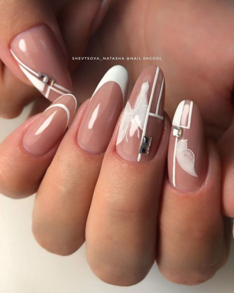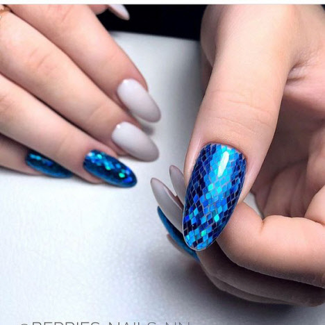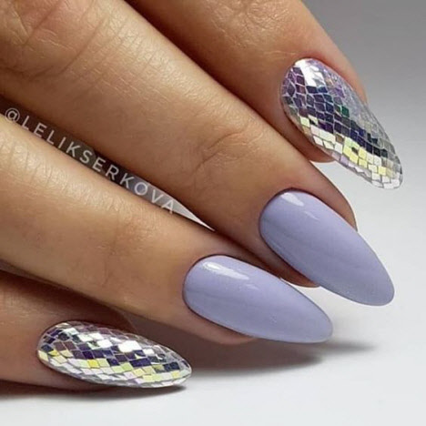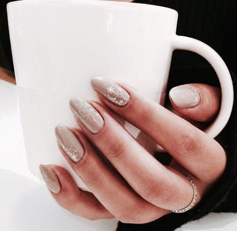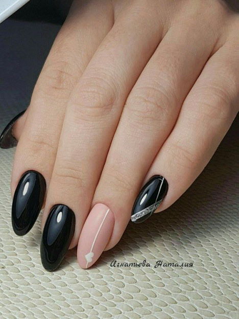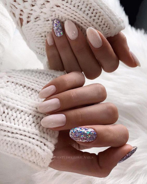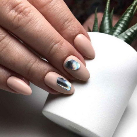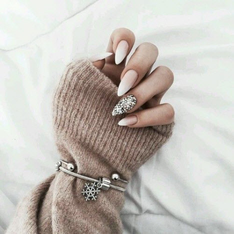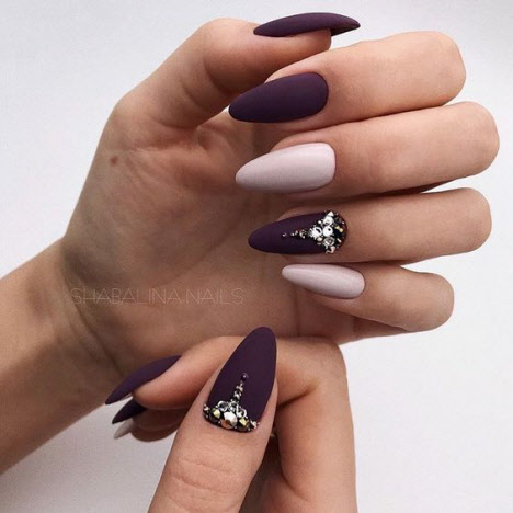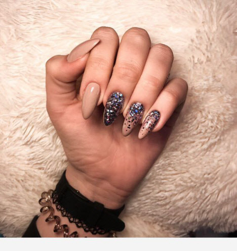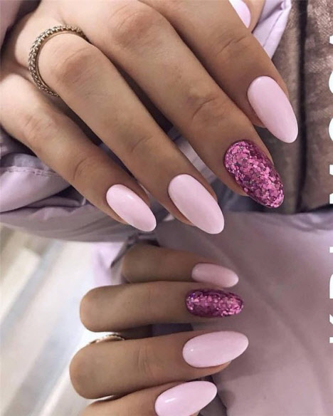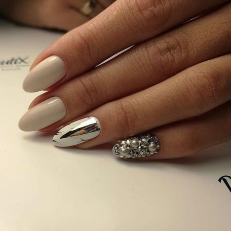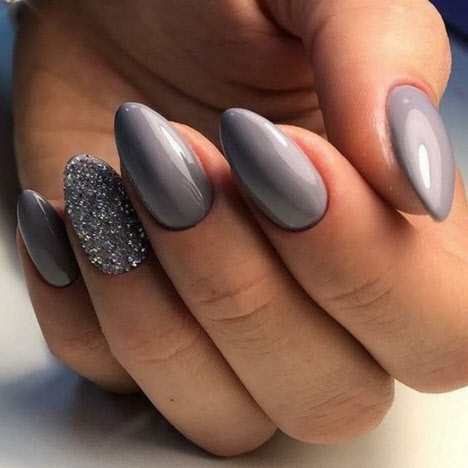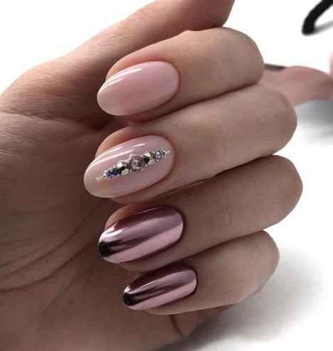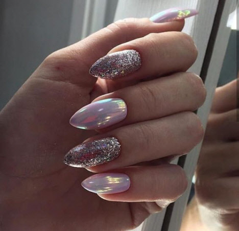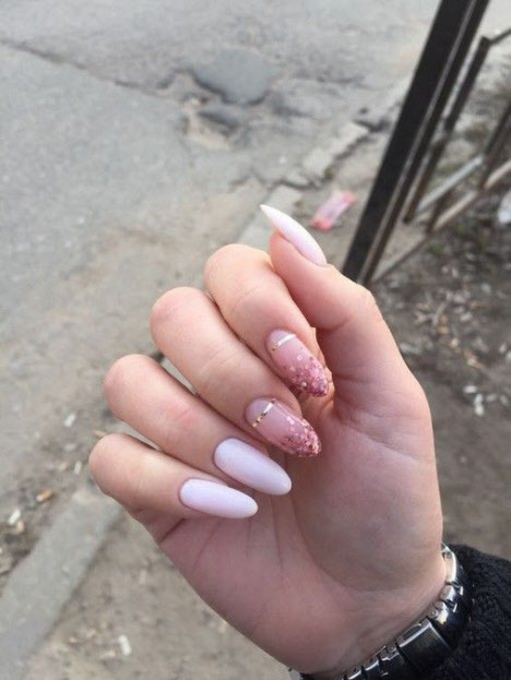 Jede Maniküre sieht auf den mandelförmigen Nägeln wunderschön aus, aber Steine und Glitzer sehen besonders schön aus. Schön angelegte Steine schmücken und abwechslungsreich Ihre übliche Maniküre, Sie brauchen nicht viele davon, konzentrieren Sie sich nur auf ein oder zwei Nägel. Dies gilt auch für Glitzer. Bei jedem Design ist es wichtig, es nicht mit der Menge an Schmuck zu übertreiben.
