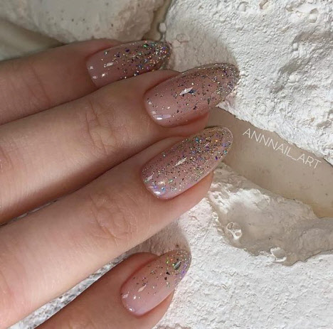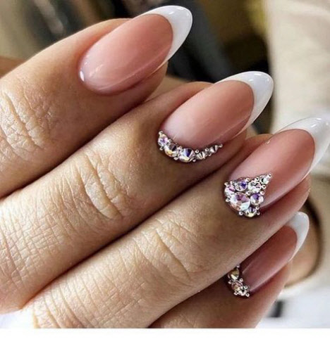 Maniküre für mandelförmige Nägel mit Funkeln und Steinen