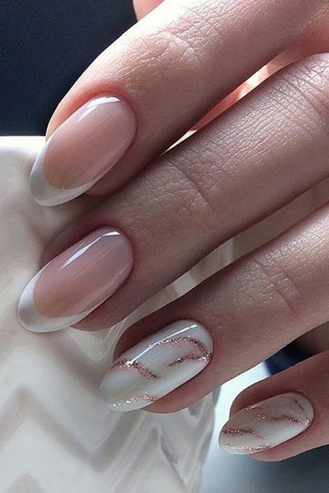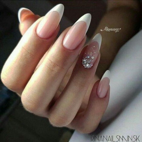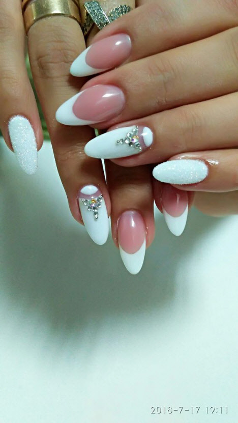 French wirkt auf jeder Art von Nägeln immer lakonisch und gleichzeitig luxuriös, dies gilt auch für mandelförmige Nägel. Es kann in klassischen Farben, in hellen Farbtönen, verziert mit Mustern, Glitzern oder Strasssteinen hergestellt werden. Und denken Sie daran, dass die Jacke eine klassische Maniküre ist, die zeitlos relevant sein wird.