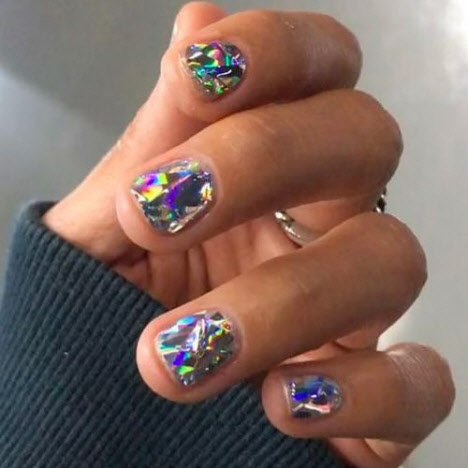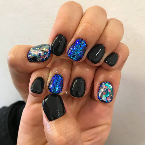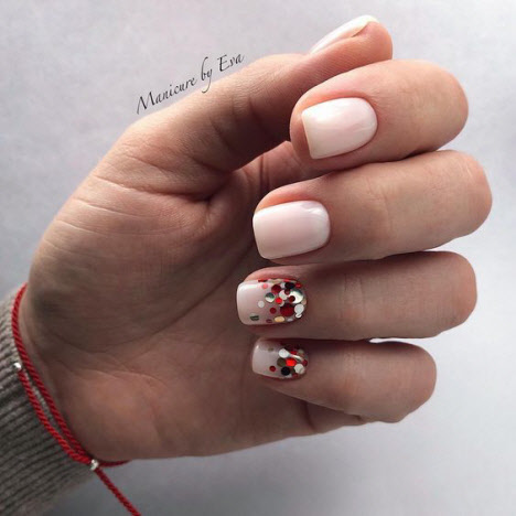 Helle Flocken, die unterschiedliche Größen, Formen und Farben haben, werden Kamifubuki genannt, sie werden oft in der Maniküre für kurze Nägel verwendet. Mit Hilfe von Kamifubuki können Sie sich auf einen oder zwei Nägel konzentrieren, oder Sie können es auf alle verwenden und nur einen bestimmten Teil der Nagelplatte hervorheben. Optionen für die Verwendung von Kamifubuki, siehe Foto unten: