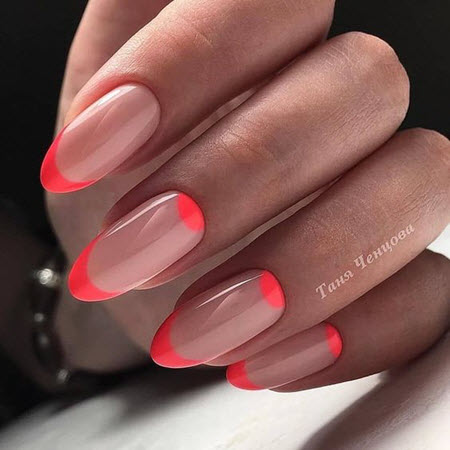 Für Mädchen, die eine ungewöhnliche Maniküre lieben, gibt es Optionen für eine helle Jacke. Bei dieser Jacke sind die Enden der Nägel nicht mit Weiß bedeckt, sondern mit einer anderen leuchtenden Farbe, zum Beispiel Rot, Pink, Blau oder Schwarz. Und die Basis selbst kann nicht mit einer beigefarbenen Lackfarbe, sondern mit einer helleren beschichtet werden.