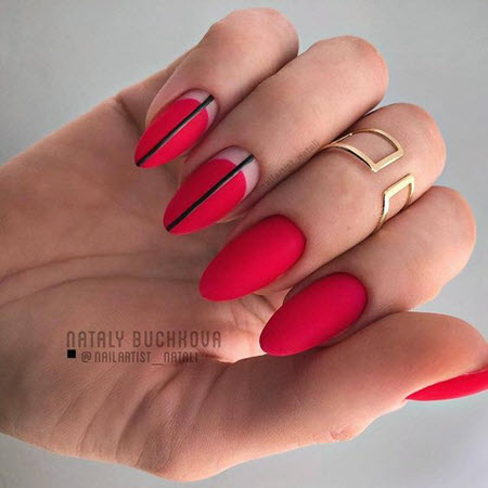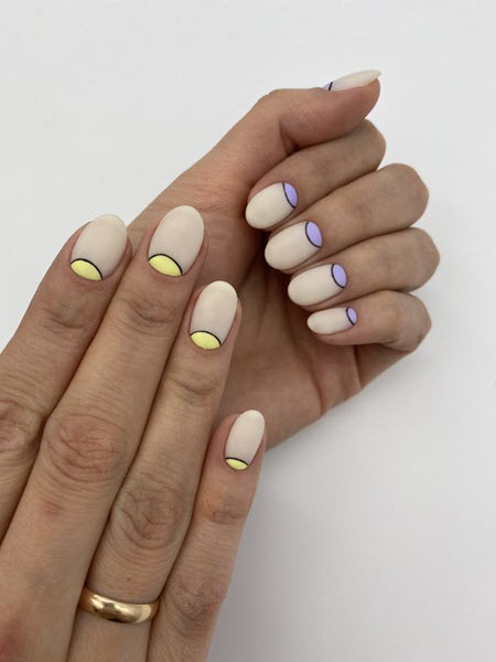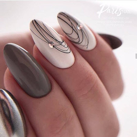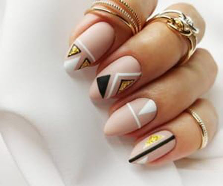Wenn wir über Designs sprechen, die zu ovalen Nägeln passen, können wir sagen, dass Geometrie jetzt an erster Stelle steht. Beim Erstellen einer schönen Komposition fällt das Design sehr schön und unauffällig aus.