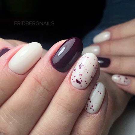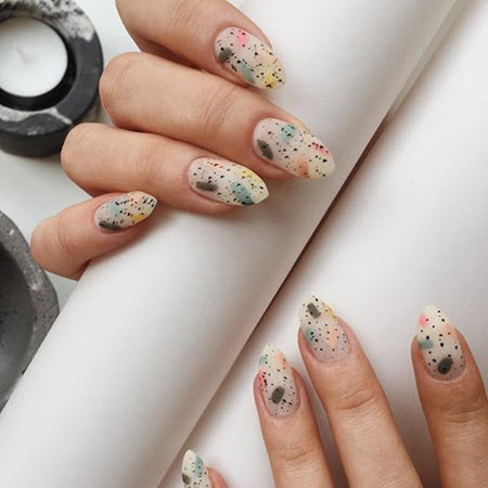 Schöne Maniküre 2024 mit Spritzern auf ovalen Nägeln