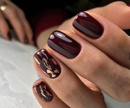 Satte Schokoladentöne eignen sich für jeden Herbstlook für die Saison 2024. Braune Maniküre sieht auf kurzen Nägeln sehr schön aus, und was das Design betrifft, wird diese Farbe ideal mit warmem Goldglitter oder Folie kombiniert.