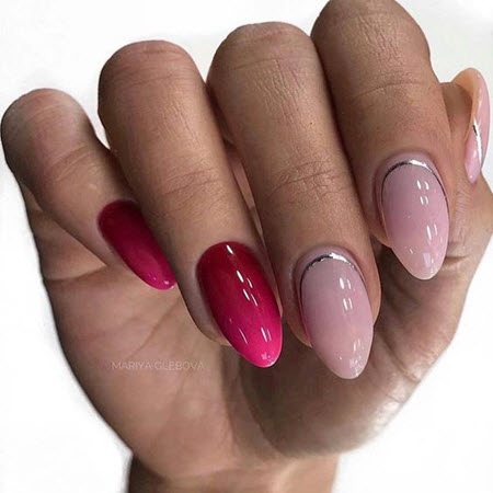 Nageldesigner experimentieren 2024 mit der Farbe der Smile-Linie und kombinieren ungewöhnliche Farben miteinander. Eine beliebte Option ist die Verlaufsversion ohne klare Übergangslinie für Liebhaber des Minimalismus.