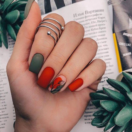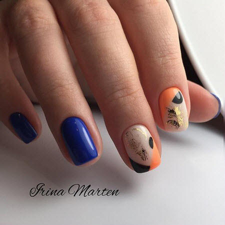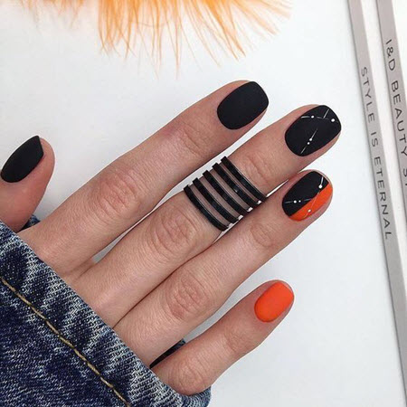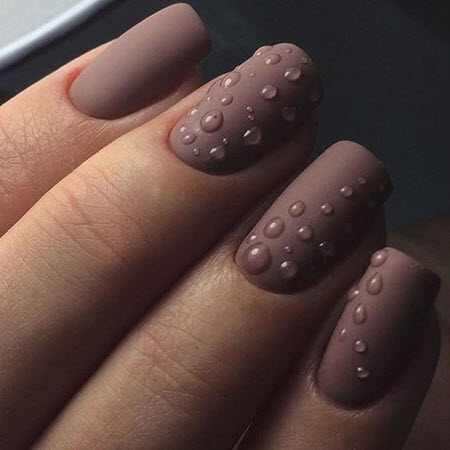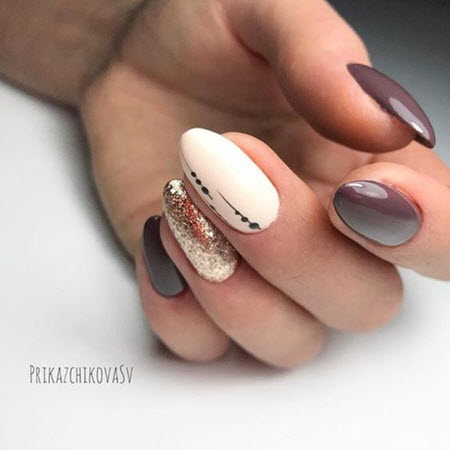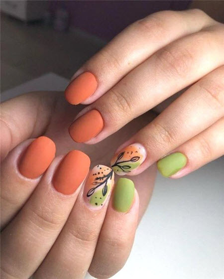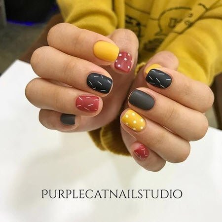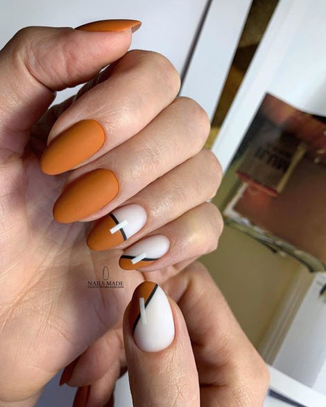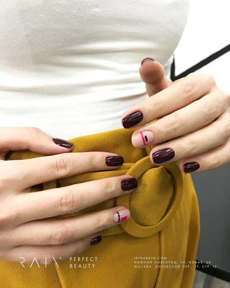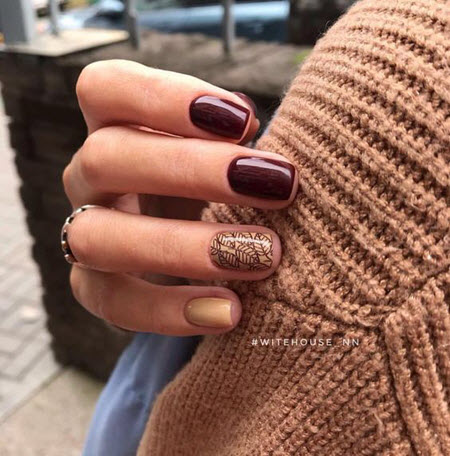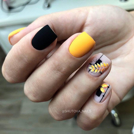 Die Herbstmaniküre ist ohne diese Nuancen einfach undenkbar. Hier sind nur kalte Gelbtöne, die im Sommer so beliebt waren, dass es besser ist, sie durch ein wärmeres Farbschema zu ersetzen, während das Design der Nägel anders sein kann.