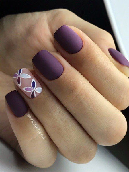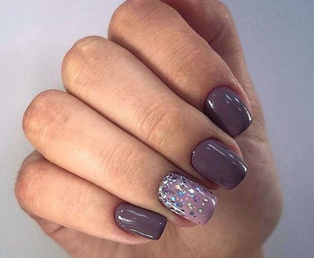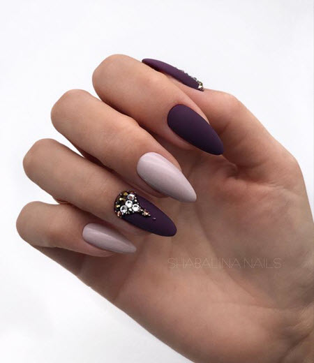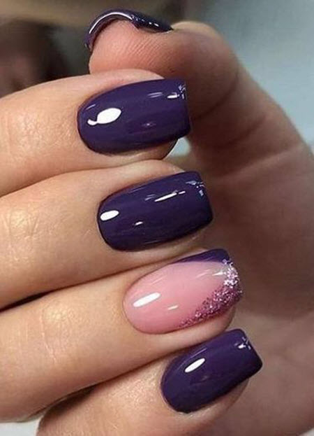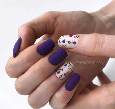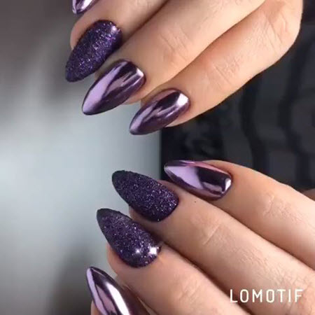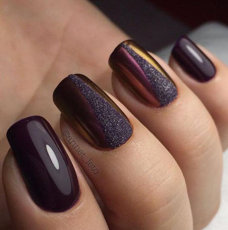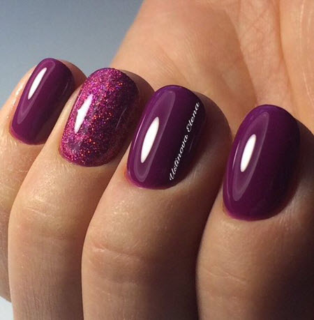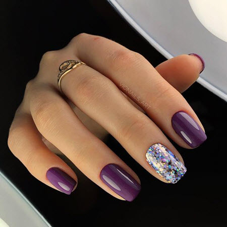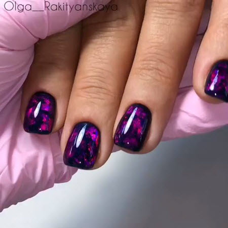 Für mehrere Saisons in Folge ist die lila Maniküre in der Herbst-Winter-Periode auf dem Höhepunkt der Popularität. Eine schöne lila Maniküre wird mit vielen Techniken und Gestaltungsarten kombiniert: verschiedene Muster, Glitzer, Steine, Folie, Kamifubuki, Reiben.