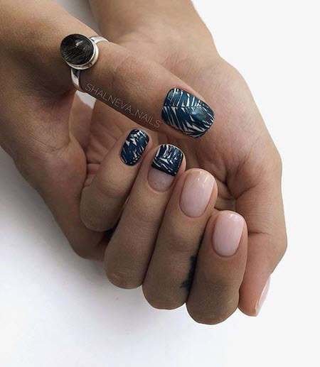 Negativraum-Maniküre ist eine Art der Maniküre, bei der ein Teil der Nagelplatte unbemalt oder mit transparentem Lack bedeckt bleibt, Negativraum kann ein chaotisches oder speziell erstelltes Muster haben.