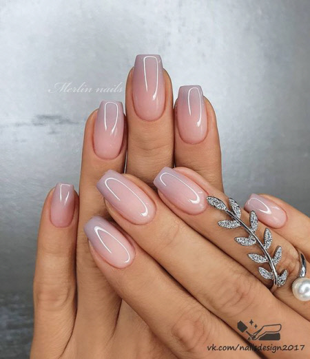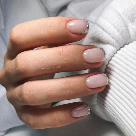 Die Überlegenheit der Nacktmaniküre in ihrer Kürze, Zurückhaltung und Genauigkeit. Es kann mit Pailletten, Steinen, Kamifubuki, Folie, Einreiben kombiniert werden, um ein trendiges und sehr stilvolles Nageldesign zu kreieren.