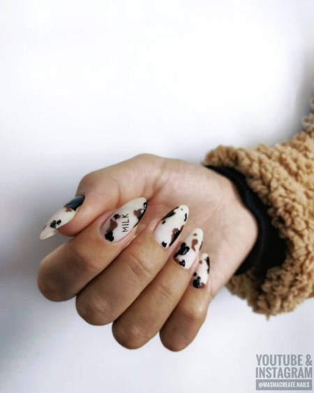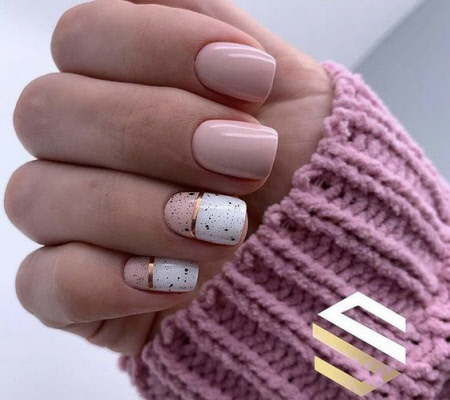 Eine Maniküre im Wachtelei-Stil ist perfekt für die Herbstmaniküre der Saison 2024. Das Design hat diesen Namen, weil die Flecken auf den Nägeln wie die Schale eines Wachteleis sind. Kleine schwarze Striche können auf allen Nägeln platziert oder auf einem oder zwei akzentuiert werden. Die klassische Version ist eine Nude-Basis und schwarze Tropfen auf allen Nägeln, Sie können aber auch andere Lacktöne (Pink, Weiß, Grau, Braun) als Basis nehmen.