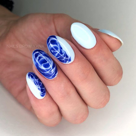 Die weiße Farbe der Blütenblätter wird oft in der Hintergrundfarbe "verwischt", und der gelbe Kern der Kamille auf den Nägeln wird oft durch goldene Strasssteine ersetzt.