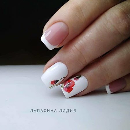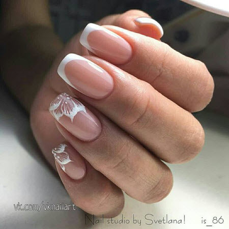 French Manicure sieht ungewöhnlich und stilvoll aus, bei der Blumen in Form eines zusätzlichen Designs hinzugefügt werden. Dieses Nageldesign passt zu jedem Outfit, das Sie tragen und wird immer im Trend liegen.