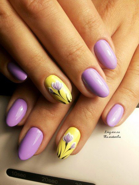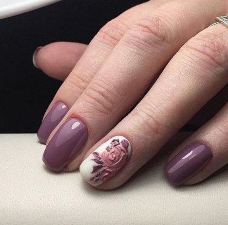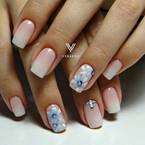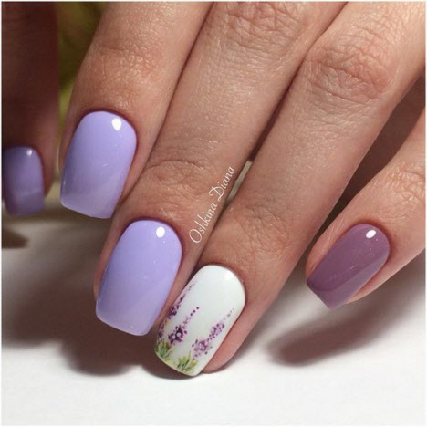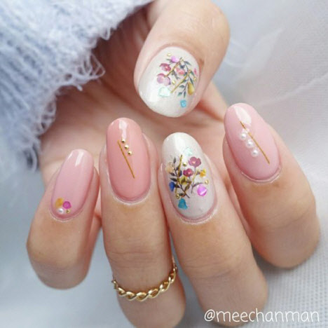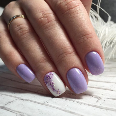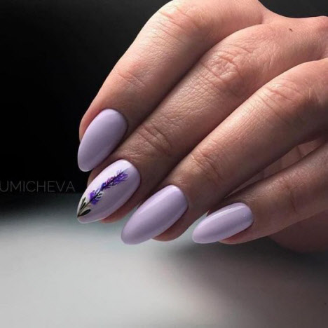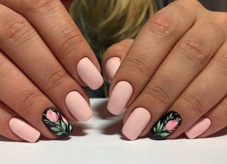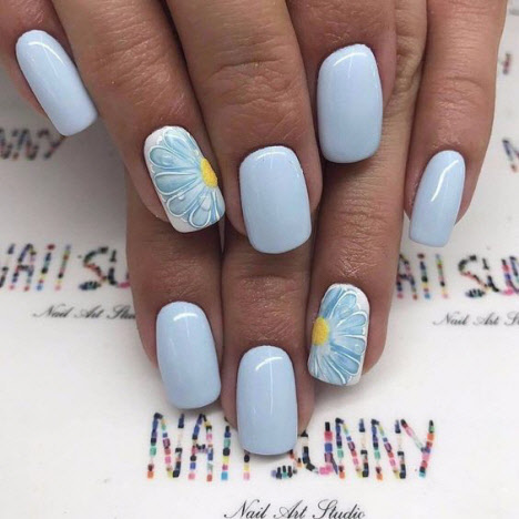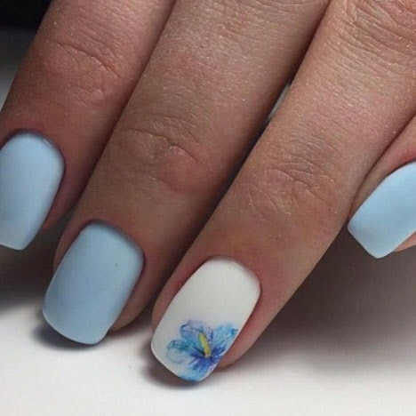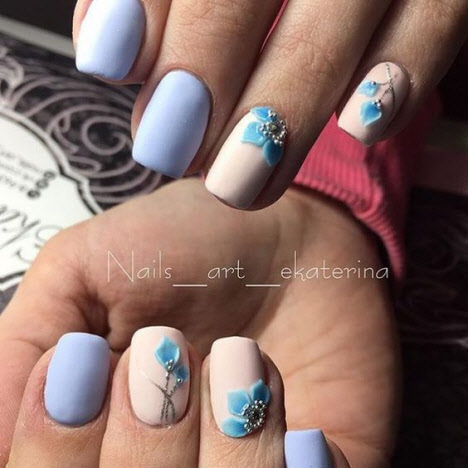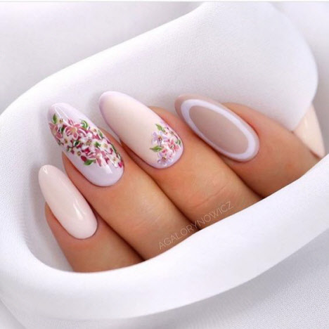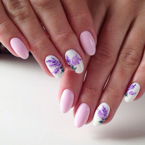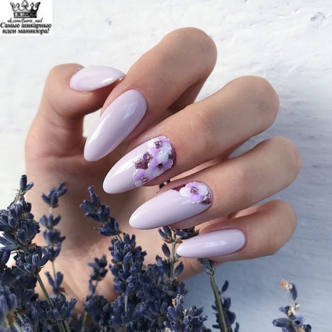 Blumen auf den Nägeln werden perfekt mit zarten Pastelltönen von Lacken kombiniert: zartes Rosa, Beige, Blau, Flieder (Milch, Joghurt). Die Blüte kann eine große auf einem Nagel oder eine kleine auf allen Ringelblumen sein. Eine solche Maniküre sieht immer sanft und romantisch aus, Bestätigung dafür ist das Foto unten: