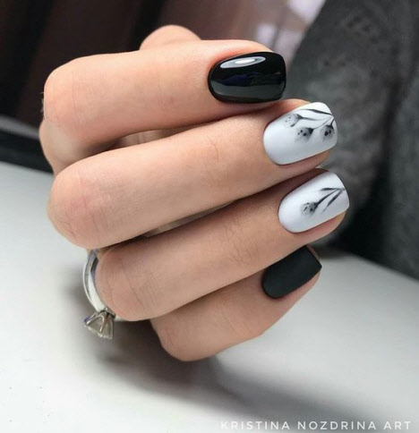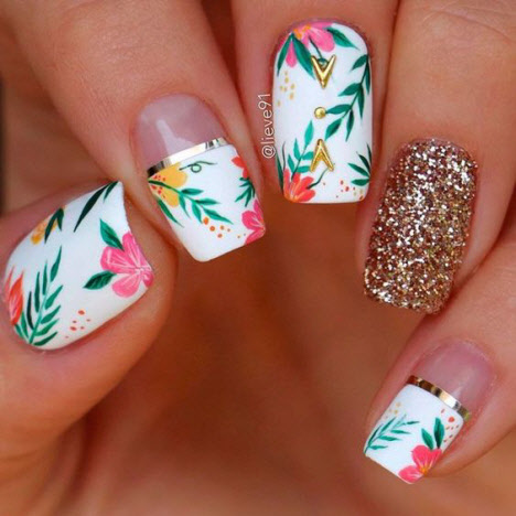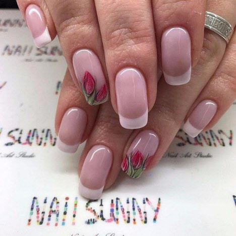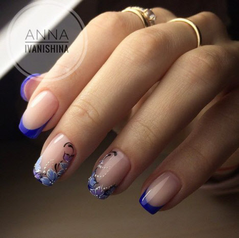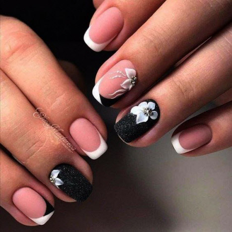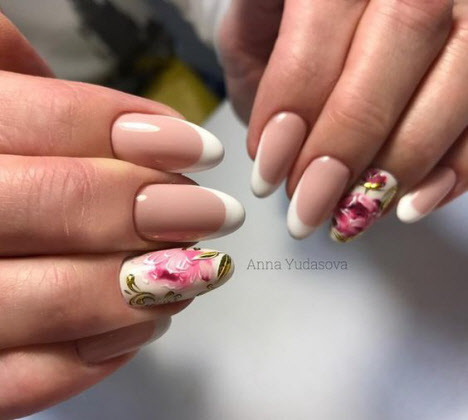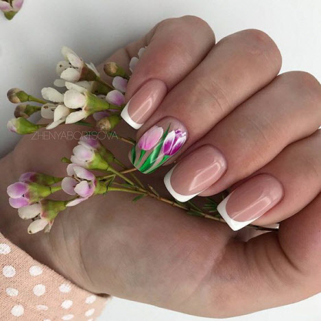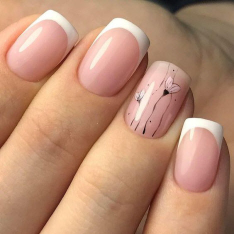 Für Fans der French Manicure kommen in dieser Saison auch florale Designs zum Einsatz. Schöne Blumen sehen mit einer French Manicure in einer klassischen weißen Version wunderschön aus, aber Sie können auch mit anderen Farben experimentieren.