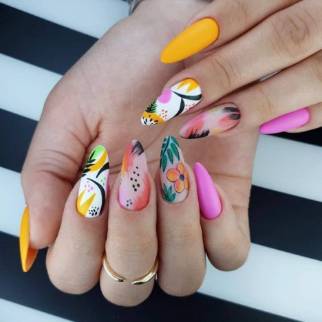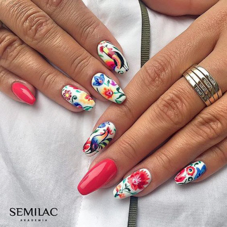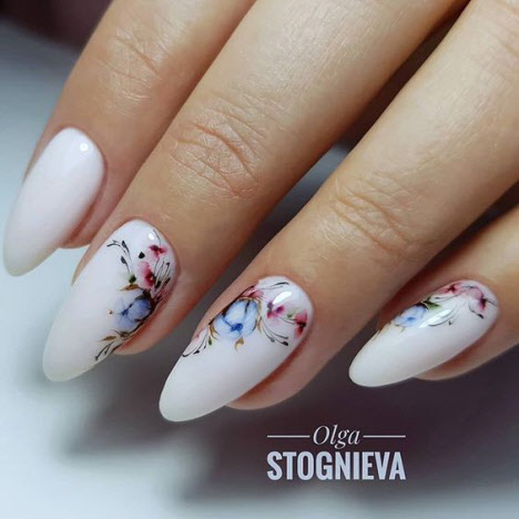 Auf langen Nägeln können Sie sich in Bezug auf das Maniküre-Design sicher bewegen. Auf langen Nägeln wirken zarte, luftige Designs mit Blumen, Zweigen und Grün besonders schön.